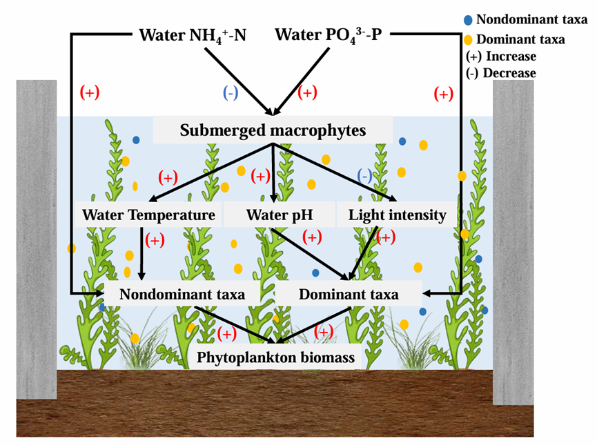 基于此,本研究依托“河北雄安白洋淀湿地野外科学观测研究站”的模拟水体富营养化实验平台,探究了水体氮、磷输入对以沉水植物为主的淡水湿地中浮游植物生物量的影响。结果表明,氮输入显著提高非优势分类群(如隐藻门、金藻门、甲藻门和裸藻门)生物量,主要是由于氮输入促进水绵生长进而增高水温导致。然而,磷输入主要促进优势分类群(如蓝藻门、绿藻门和硅藻门)生物量,这主要归因于磷输入提高水体pH值并降低水体光照强度。此外,在富营养化环境中,浮游植物生物量的增加会促进湿地甲烷排放。这些发现可为控制藻类繁殖、减缓水体富营养化及控制湿地温室效应提供重要见解。