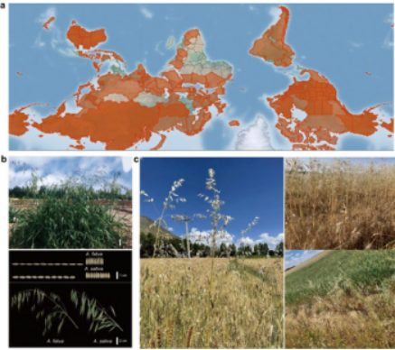 图1. 野燕麦植株形态与田间表型 a, 野燕麦的全球分布及危害程度 (https://www.cabidigitallibrary.org); b, 野燕麦植株以及穗子形态; c, 西藏、新疆和张家口野燕麦采样环境