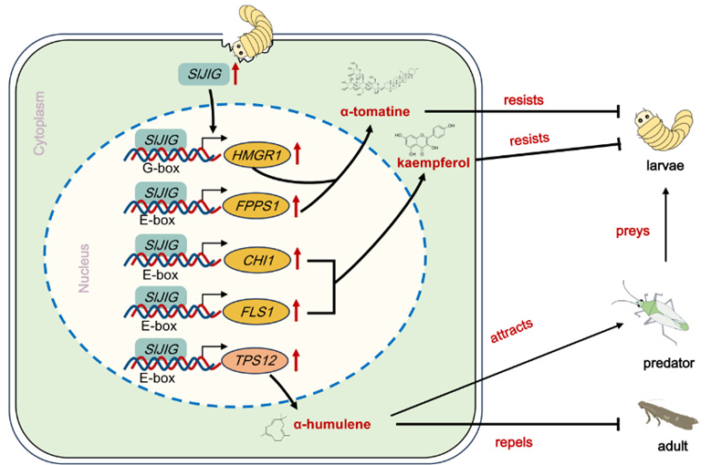 近日,河北大学孙江华团队康志伟副教授在国际知名学术期刊New Phytologist(中科院1区TOP期刊,五年影响因子:10.3)在线发表了题为“Transcription factor SlJIG orchestrates multi-layer defense in tomato against the invasive pest Phthorimaea absoluta”的研究论文。本研究发现,bHLH转录因子SlJIG在番茄潜叶蛾取食、茉莉酸甲酯和机械损伤后显著高表达。番茄潜叶蛾在SlJIG突变体材料上的幼虫取食面积、蛹重和产卵量显著升高,但抑制了番茄潜叶蛾幼虫为害后对番茄潜叶蛾天敌昆虫波式烟盲蝽的吸引力。转录组和代谢分析显示,SlJIG突变体中番茄抗虫物质番茄碱和类黄酮的含量显著降低。代谢物回补实验证明,番茄碱和山奈酚是番茄抵御番茄潜叶蛾幼虫为害的防御物质。挥发物分析结合行为学实验显示,蛇麻烯对番茄潜叶蛾具有驱避性,但对波式烟盲蝽具有吸引性。进一步通过酵母单杂交、双荧光素酶和EMSA实验,作者发现SlJIG通过结合番茄碱、山奈酚和蛇麻烯合成基因启动子上的G-box和E-box序列正调控这些基因的表达。本研究解析了bHLH转录因子SlJIG调控番茄对番茄潜叶蛾抗性的分子机制,丰富了bHLH转录因子家族的生物学功能,也为番茄抗虫育种具有重要指导意义。