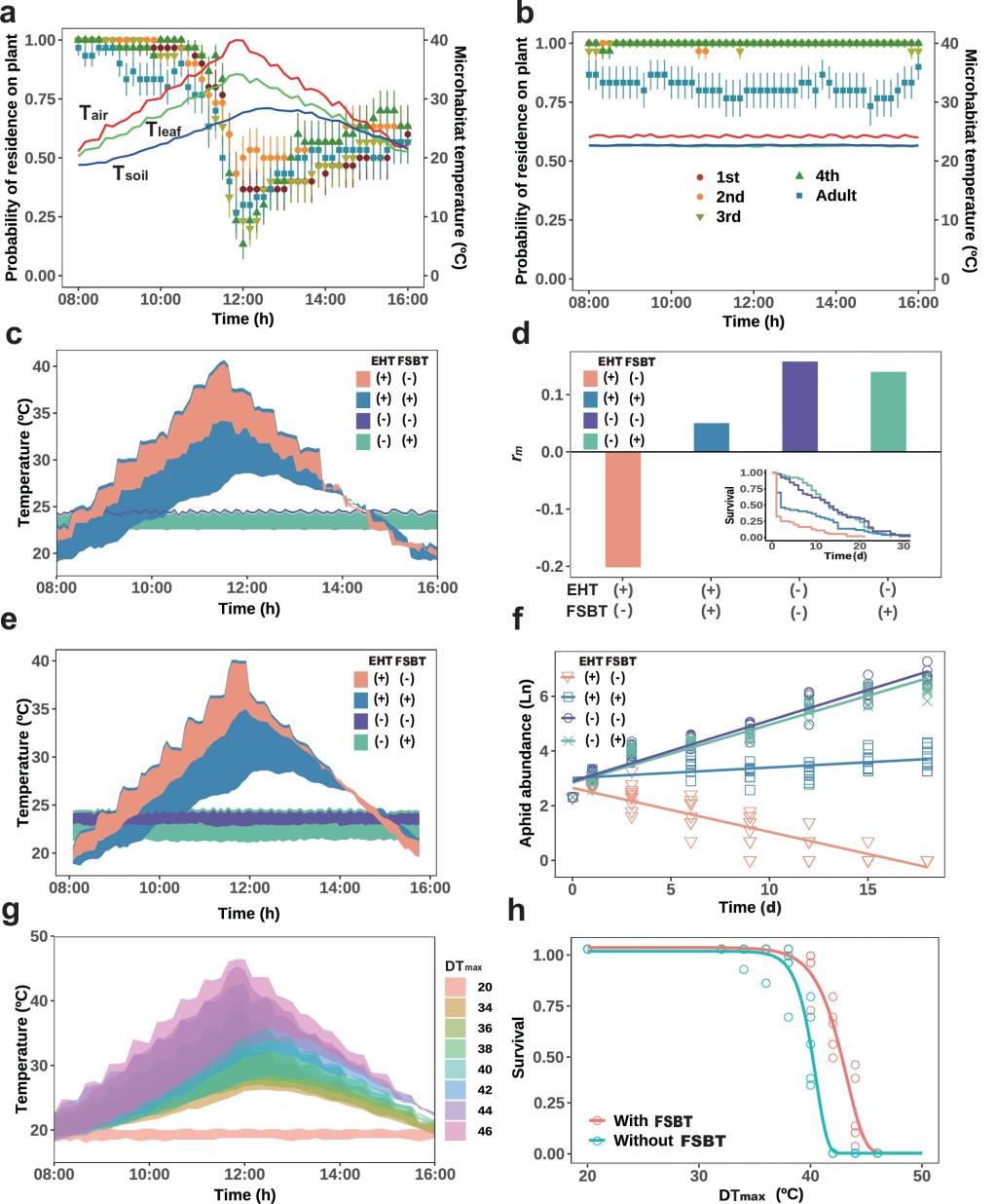 图1. 麦长管蚜在的体温调节行为及其对高温下蚜虫存活和种群增长的影响