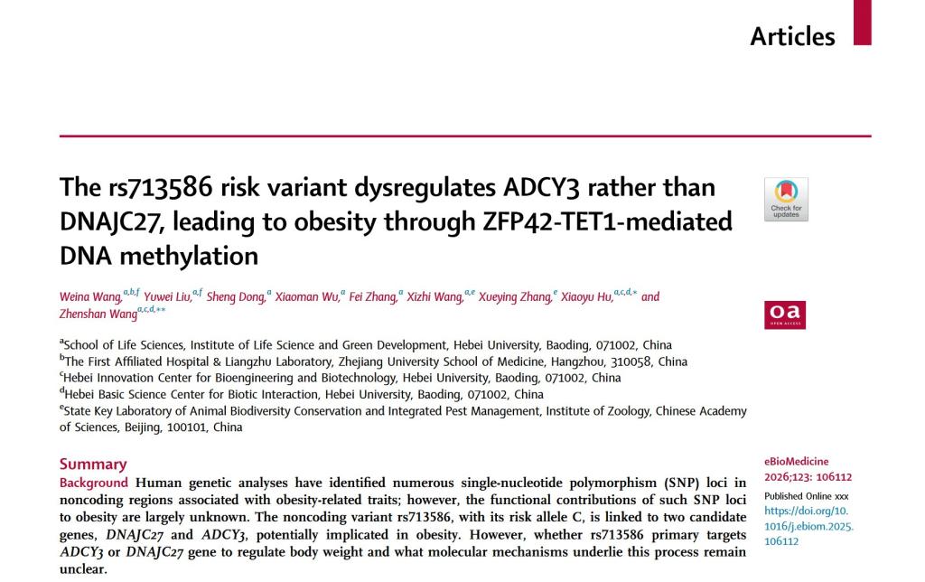 2026年01月,王振山教授课题组在eBioMedicine(柳叶刀子刊,中科院双一区,影响因子10.8)在线发表论文《The rs713586 risk variant dysregulates ADCY3 rather than DNAJC27, leading to obesity through ZFP42-TET1-mediated DNA methylation》。该文一经发表,就被科研猫平台作为“亮点论文”重点推送。