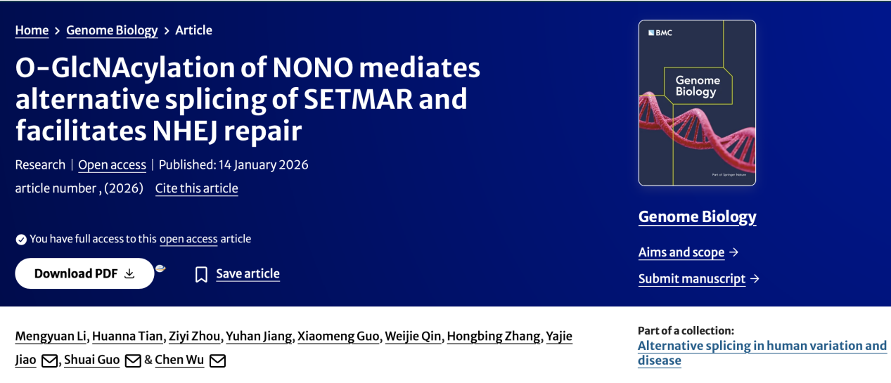 2026年1月14日,河北大学生命科学学院吴琛教授、郭帅副研究员与北京蛋白质组研究中心焦雅洁博士合作,在国际基因组学顶级期刊《Genome Biology》(中科院一区Top期刊,IF5-Year:16.3)在线发表了题为“O-GlcNAcylation of NONO mediates alternative splicing of SETMAR and facilitates NHEJ repair”的研究论文。该研究首次系统阐明了NONO蛋白的O-GlcNAc糖基化修饰通过调控SETMAR基因的可变剪接,进而激活非同源末端连接(NHEJ)修复通路、导致肝癌细胞辐射抵抗的完整分子机制,为逆转肿瘤放疗抵抗提供了全新的表观遗传干预思路。